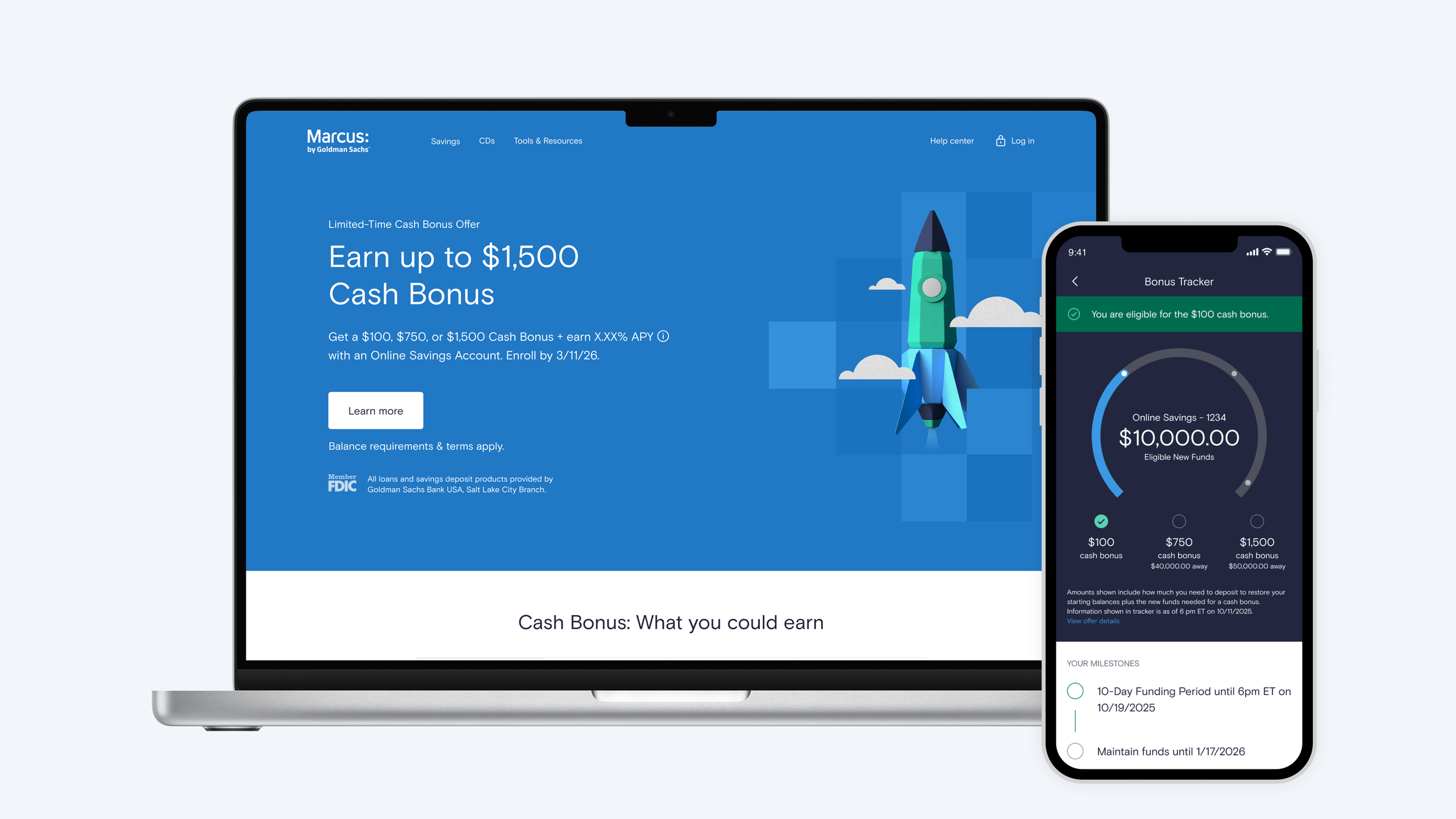 A new three-tier cash promotion designed to accelerate deposit growth into Online Savings Account products. The initiative targets both new and existing Marcus customers.